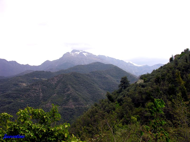 Les paysages montagneux autour de Castel Vittorio avec le Monte Toraggio partiellement enneigé :